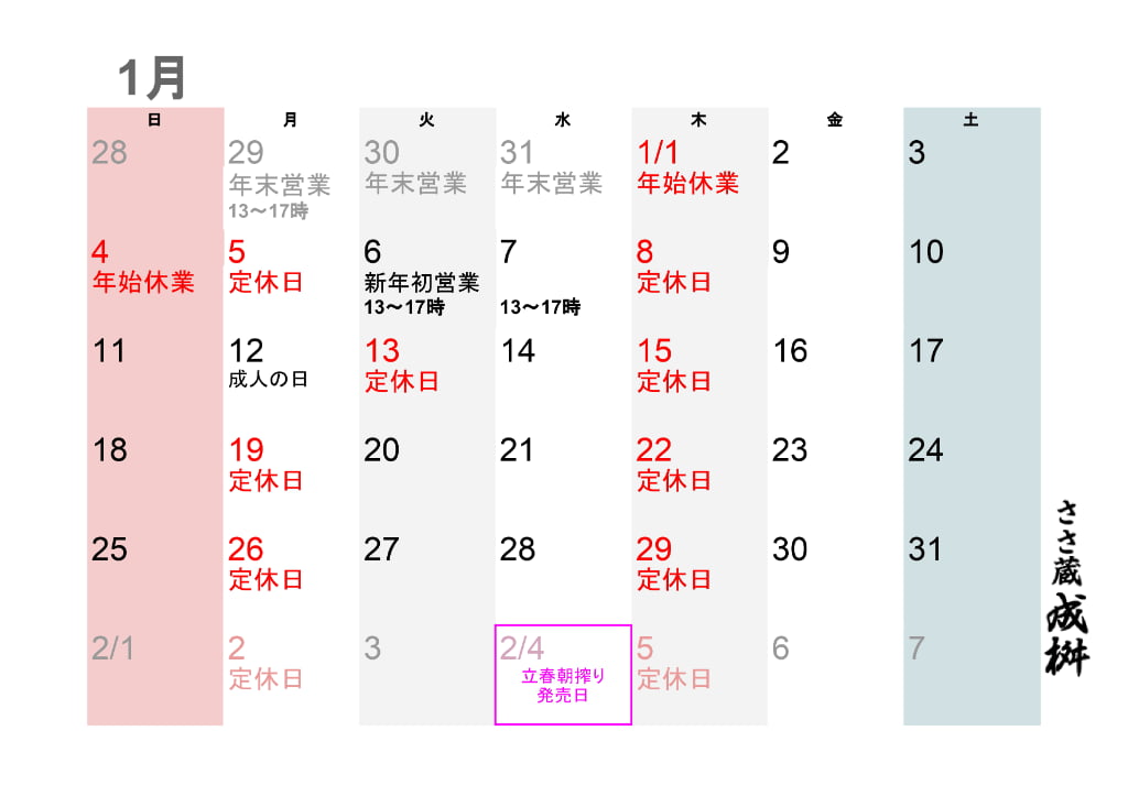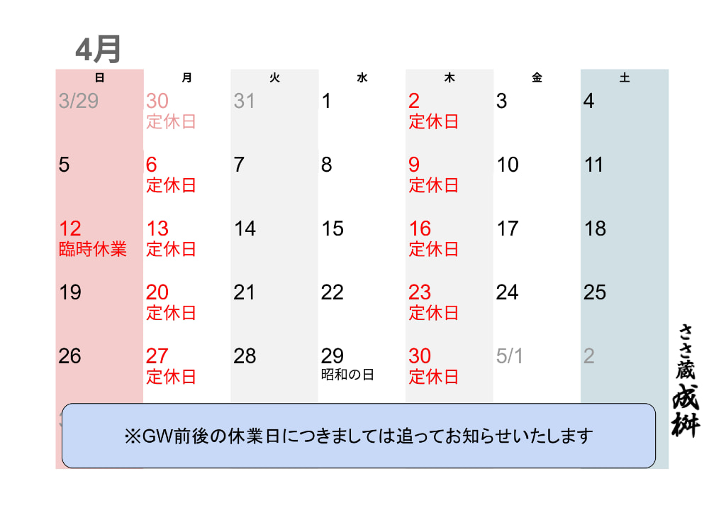 2023.10 定休日変更のお知らせ10月から週休2日(月・木)は定休日とさせていただきます。定休日が祝日の場合は翌日にお休みさせていただきます。みなさまには大変ご不便をお掛け致しますが、何卒ご理解賜ります様お願い申し上げます。