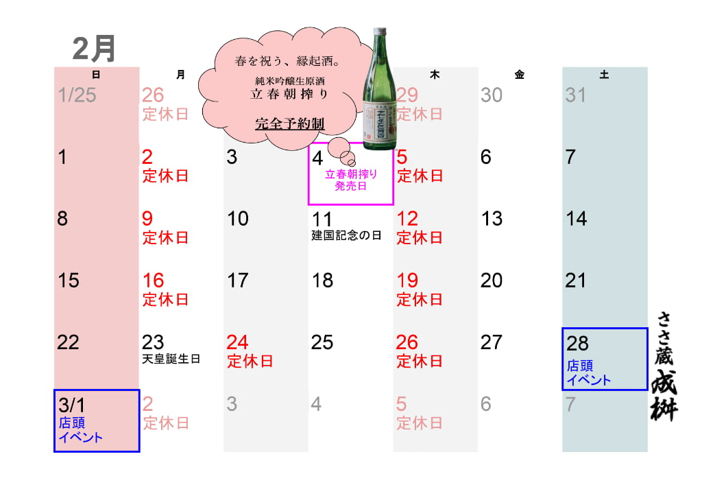 2026.02 2月の営業のお知らせ2月28日(土)、3月1日は当店恒例のイベント開催日です!月曜・木曜が定休日ですが、祝日の場合は営業、翌日が振替で休業日となります。詳しくはカレンダーをご覧ください!